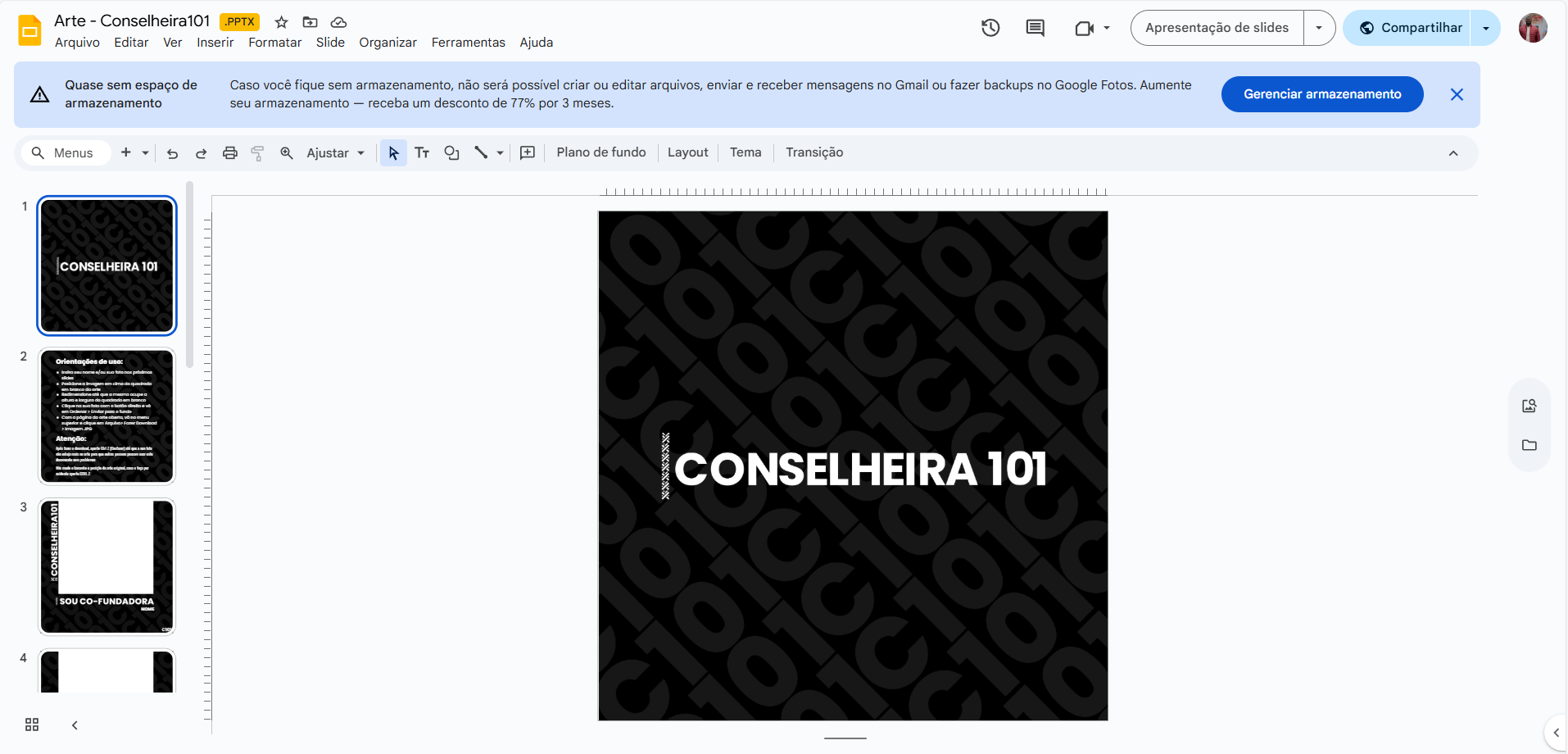 Indo um pouco mais além, transformei o material lá de cima em artes editáveis com algumas orientações. A ideia foi delas, para que pudessem ser mais ágeis nos processos, não necessitando do meu suporte em toda tomada de decisão... Também foram desenvolvidas apresentações para que as próprias editassem.